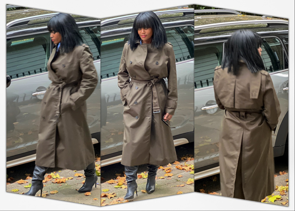 To put that versatility into practice, here’s what I’m styling this week. Right now, I’ve been pairing my beige trench with light knits, cropped jeans, and gold hoops for those mild London afternoons that start sunny but end with a chill. The olive trench comes out for weekend walks or spontaneous dinner plans, worn with black jeans, ankle boots, and a camel scarf. Both make me feel confident, grounded, and ready for the colder days ahead.