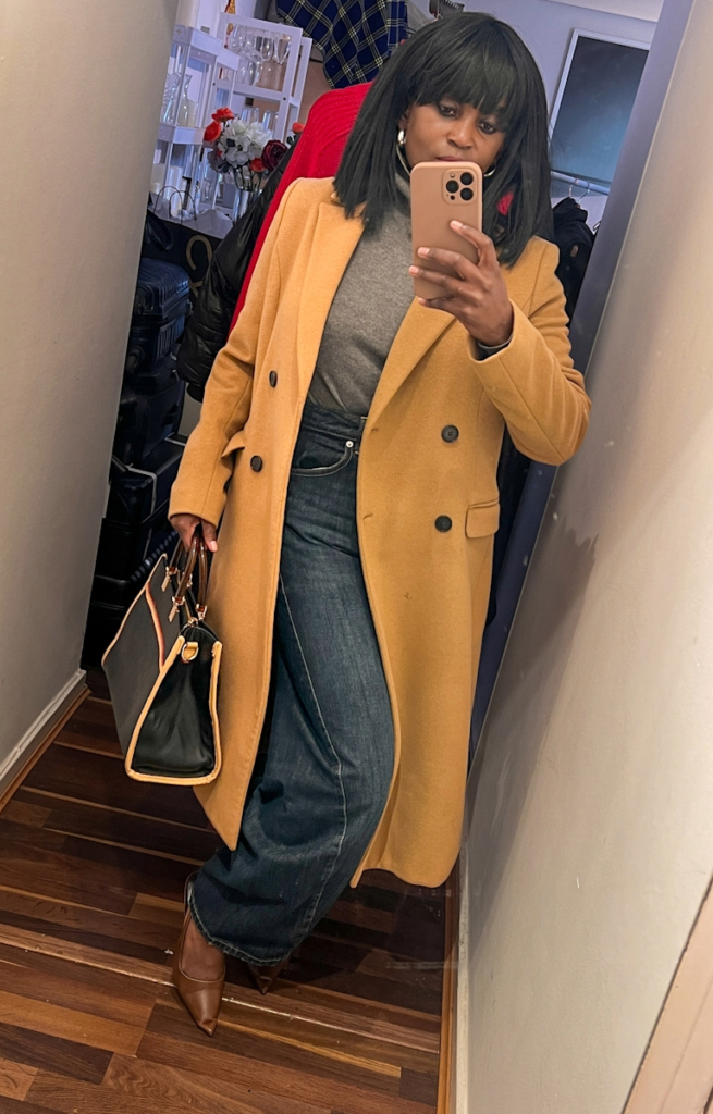 Chocolate brown adds a depth that feels warm and grounding, and it shifts beautifully depending on what you pair it with. Worn with cream wide-leg trousers, the turtleneck leans into a soft, minimal palette that feels calm, bright and effortlessly elegant. The silhouette stays clean and elongating, making it an easy choice for everyday winter dressing.