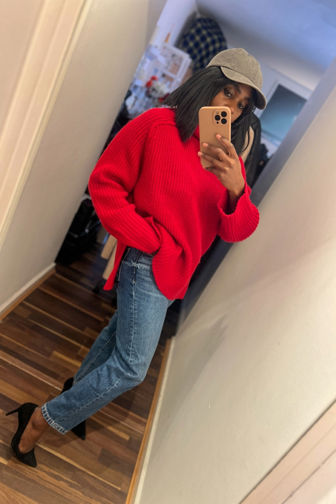 Red Chunky Turtleneck + Straight Jeans + Black Heels + Grey Cap
